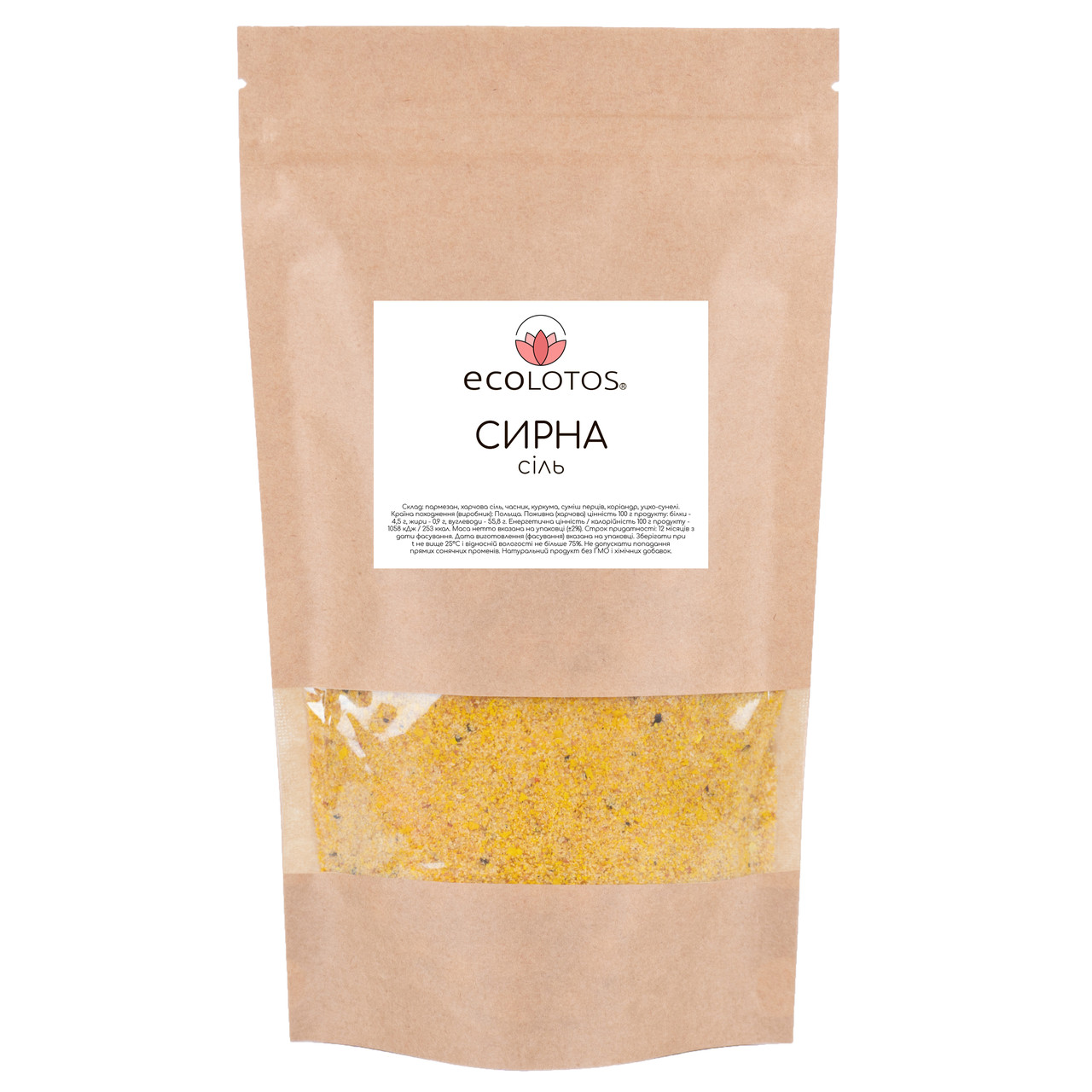 Склад: пармезан, харчова сіль, часник, куркума, суміш перців, коріандр, уцхо-сунелі.